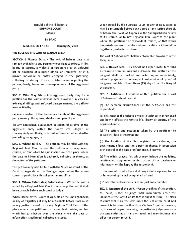 A M No 08 1 16 Sc (The Rule On The Writ of Habeas Data) : Homehome