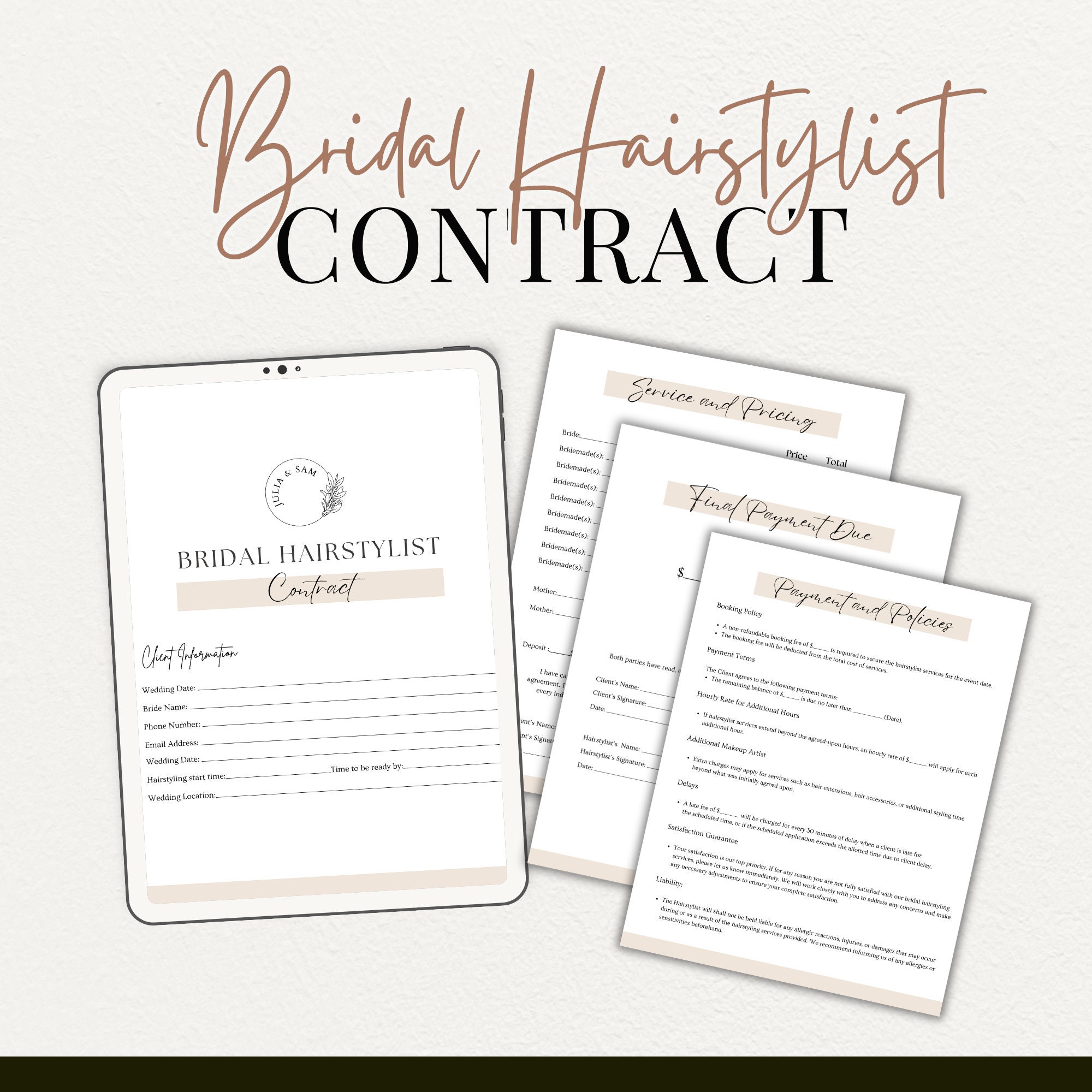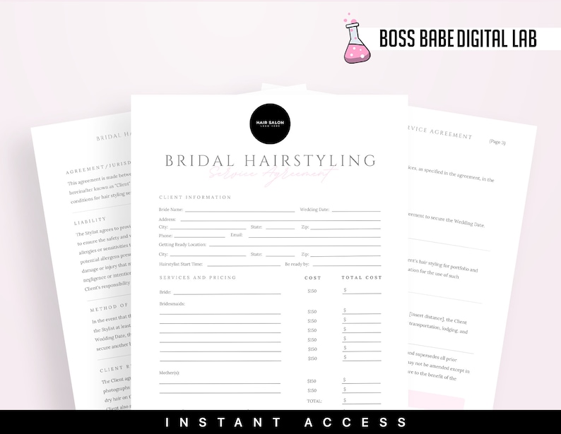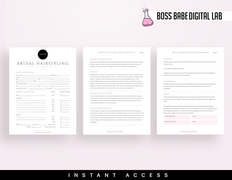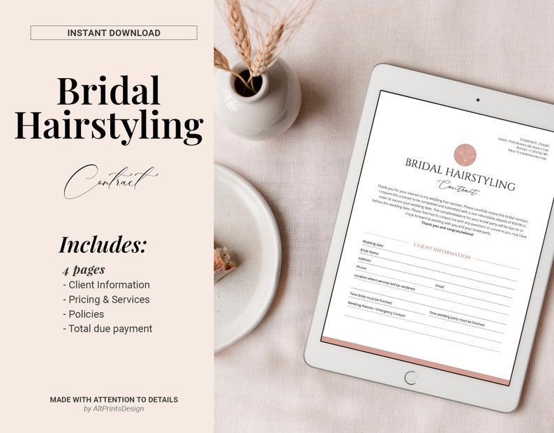 Bridal Hair Contract Template for Hairstylist Freelance Wedding Bridal
