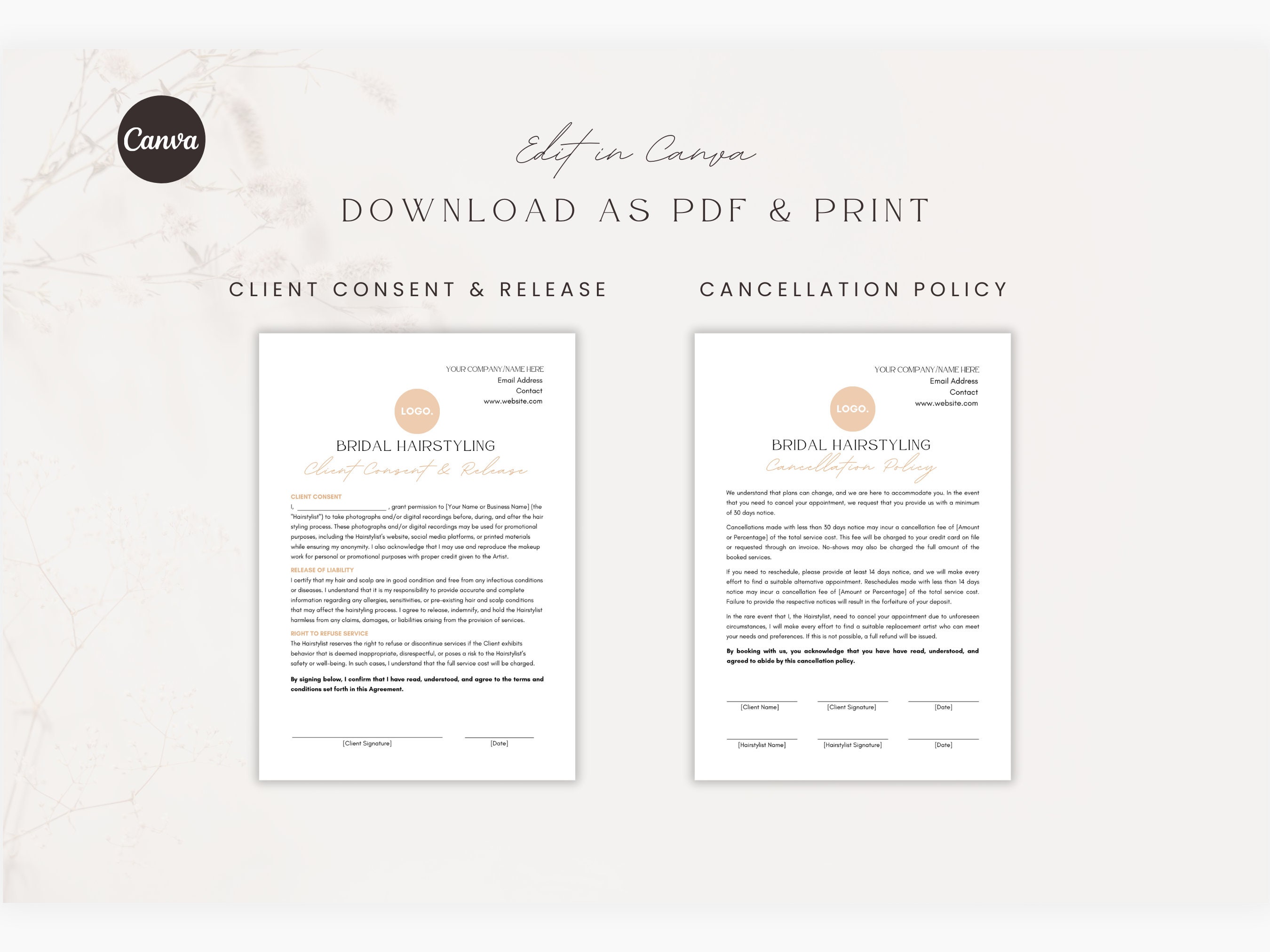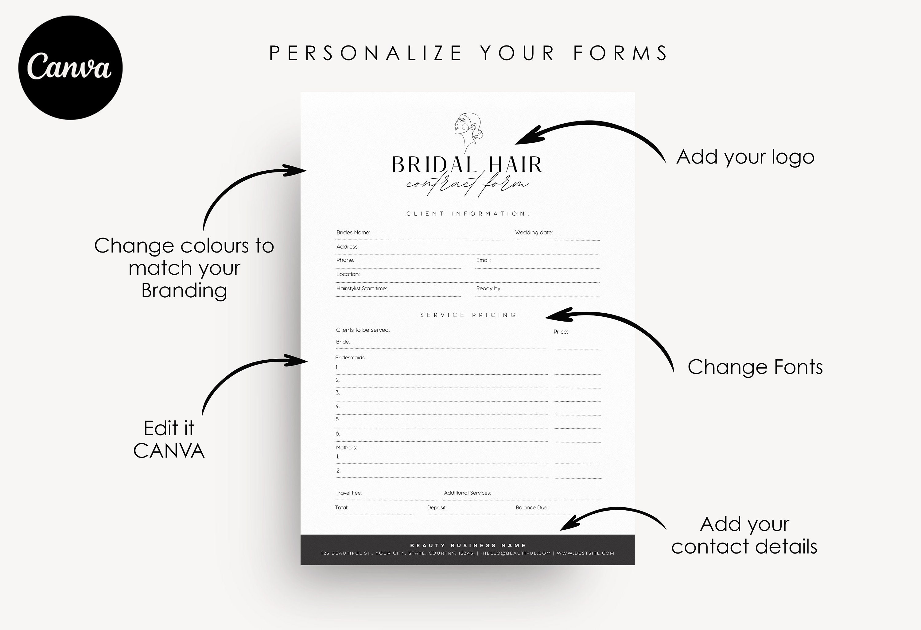 Bridal Hair Contract Template Canva Template Editable Hairstyling
