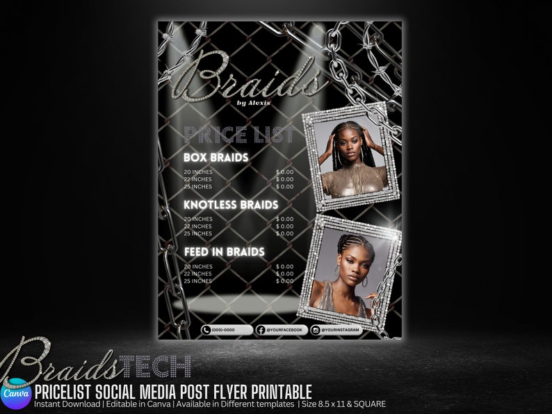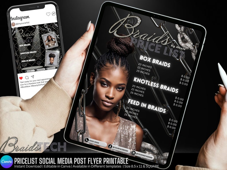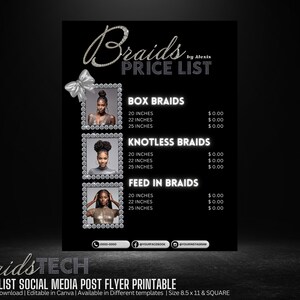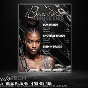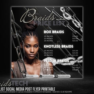 Braids Price List Flyer Template Canva Editable Hair Stylist Beauty