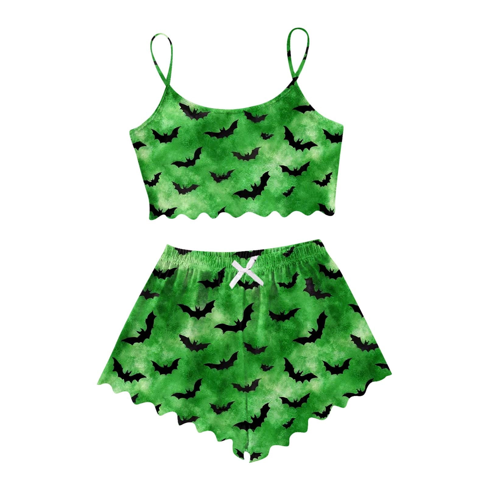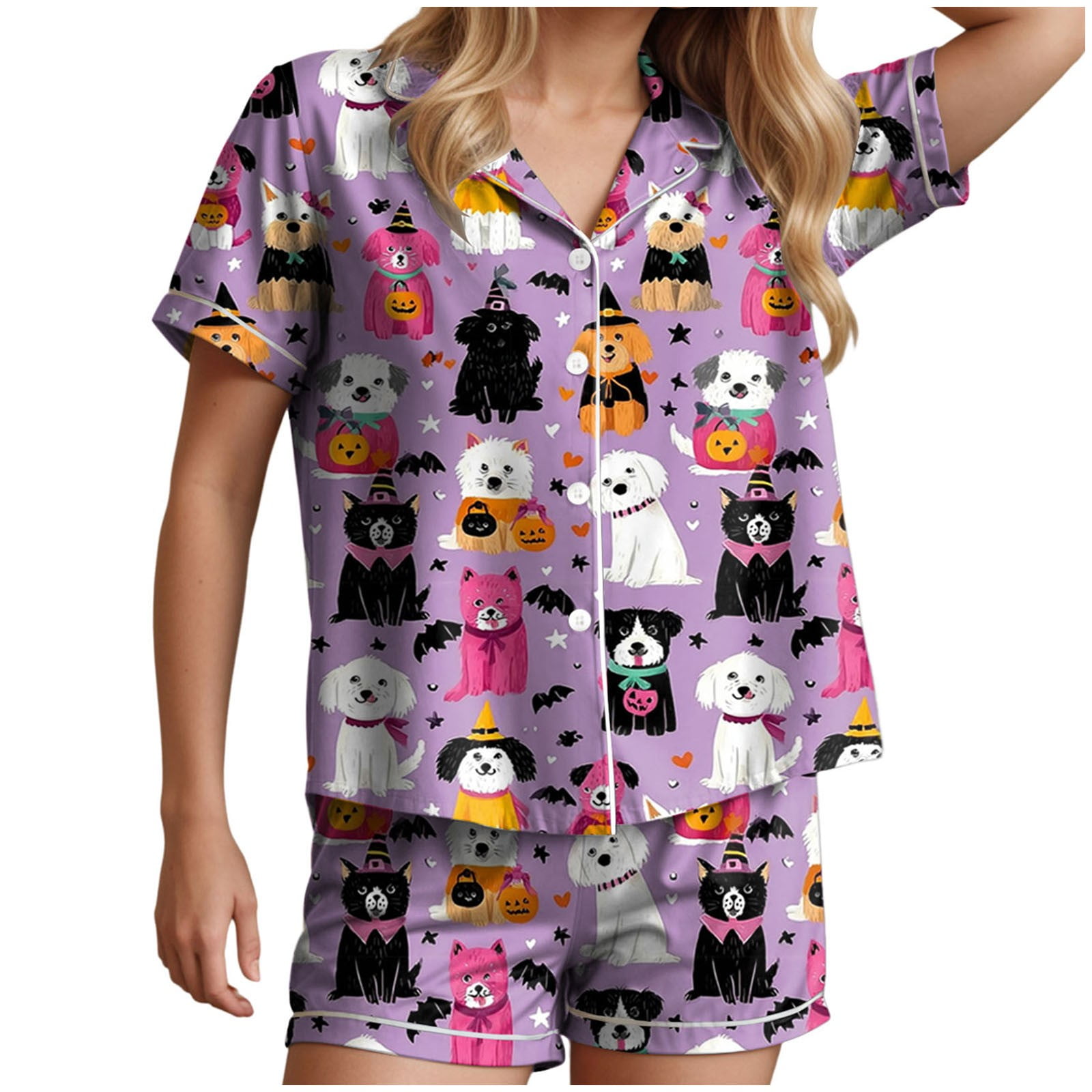 Satin Pajamas Women Halloween Pjs Women Bat Print Short Sleeve Button
