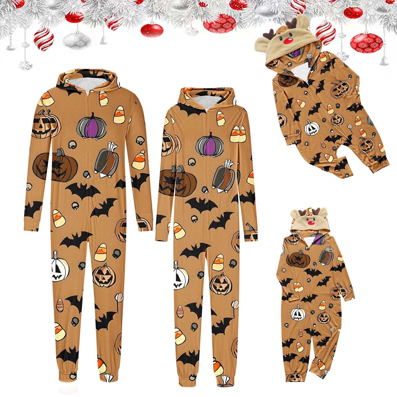 Riecok PJ Family Matching Halloween Pumpkins Bat Print Zipper Jumpsuits