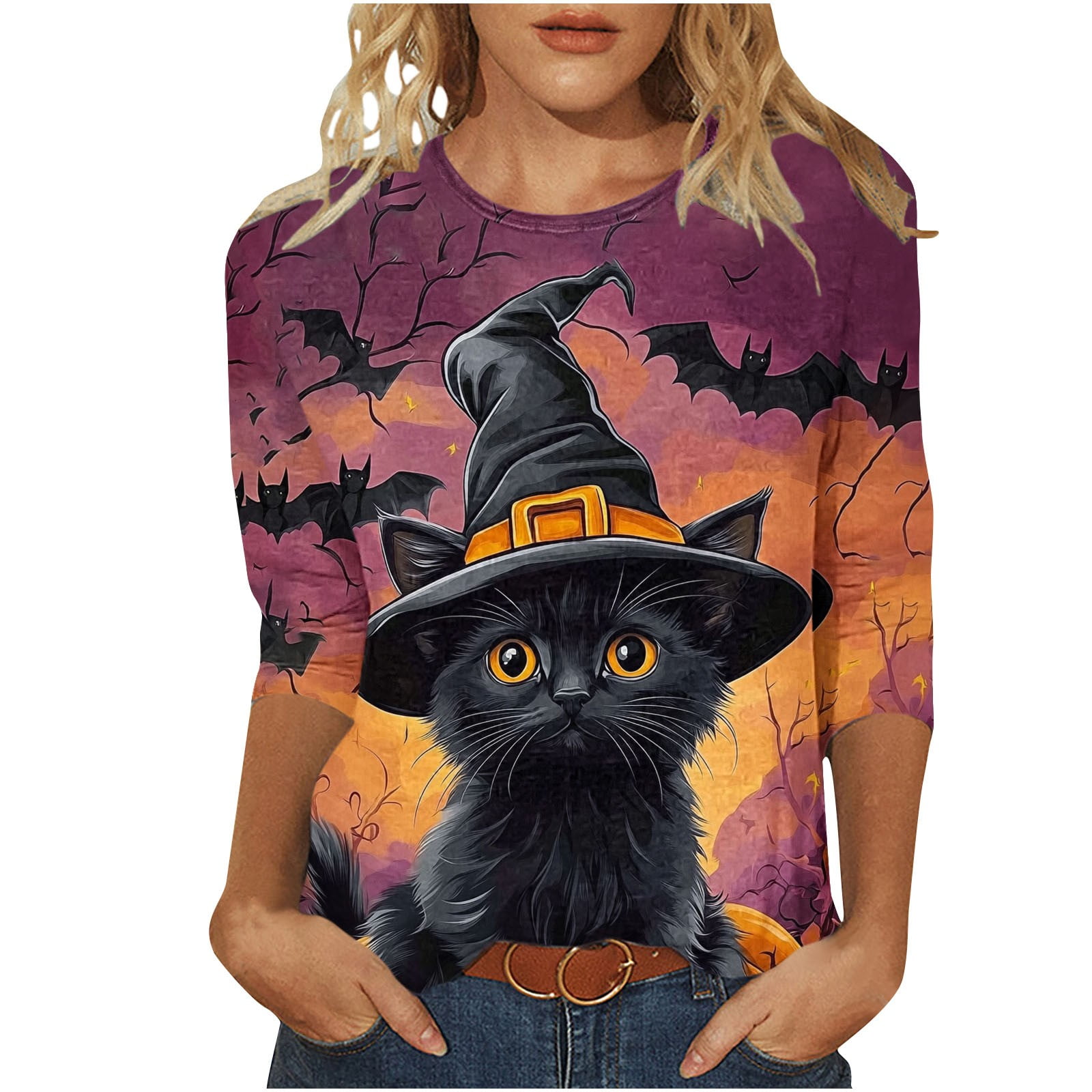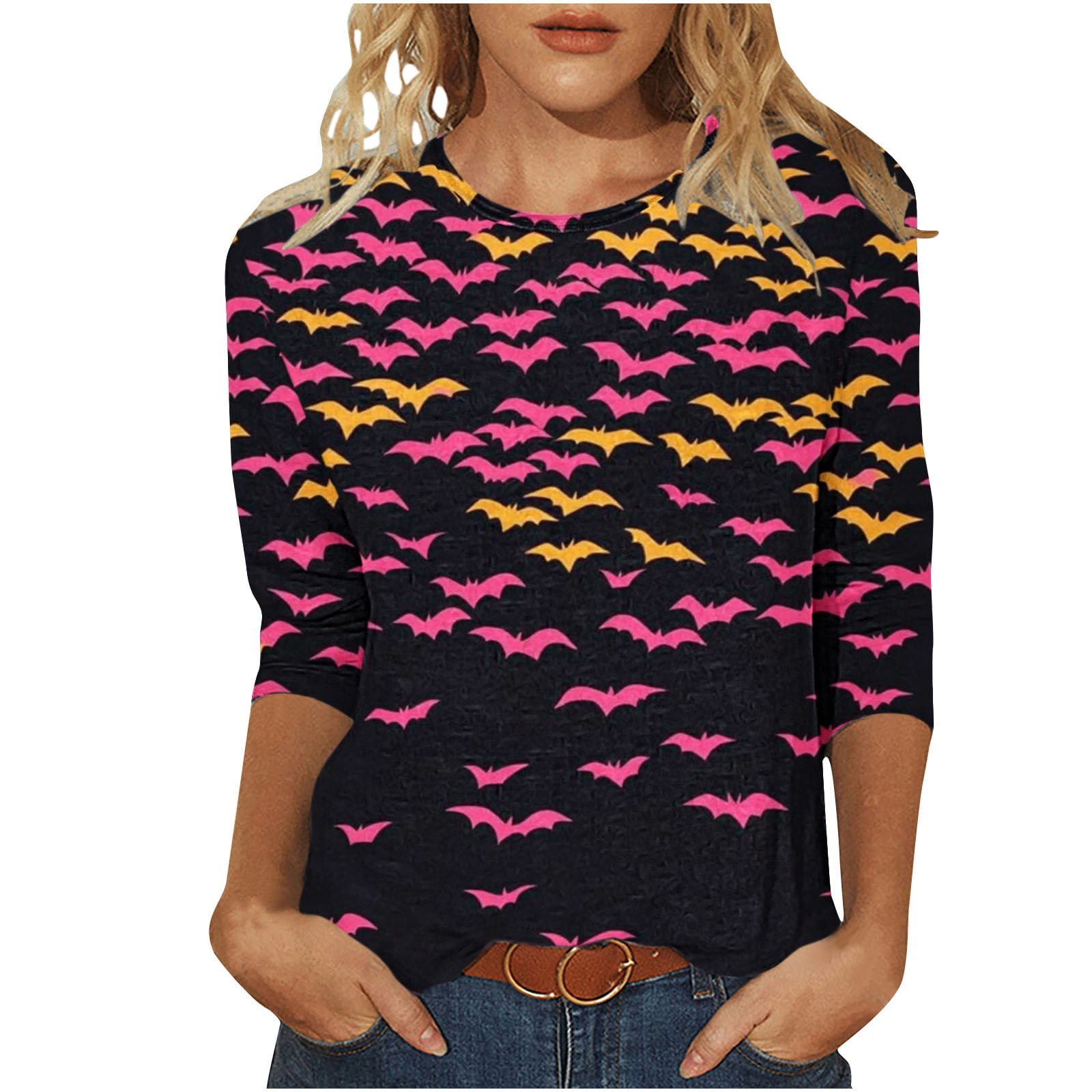 aohooy Halloween Funny Shirts Women Bats Witch Pumpkin Print 3/4 Length