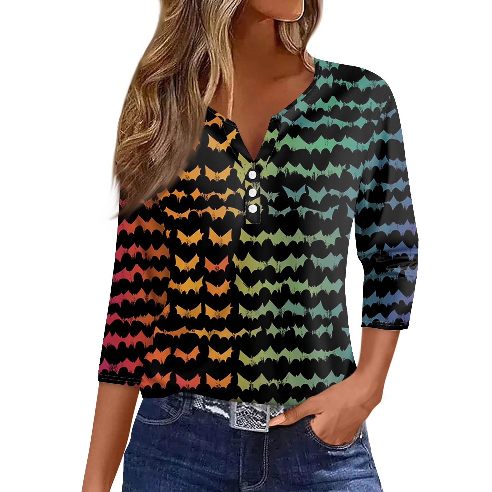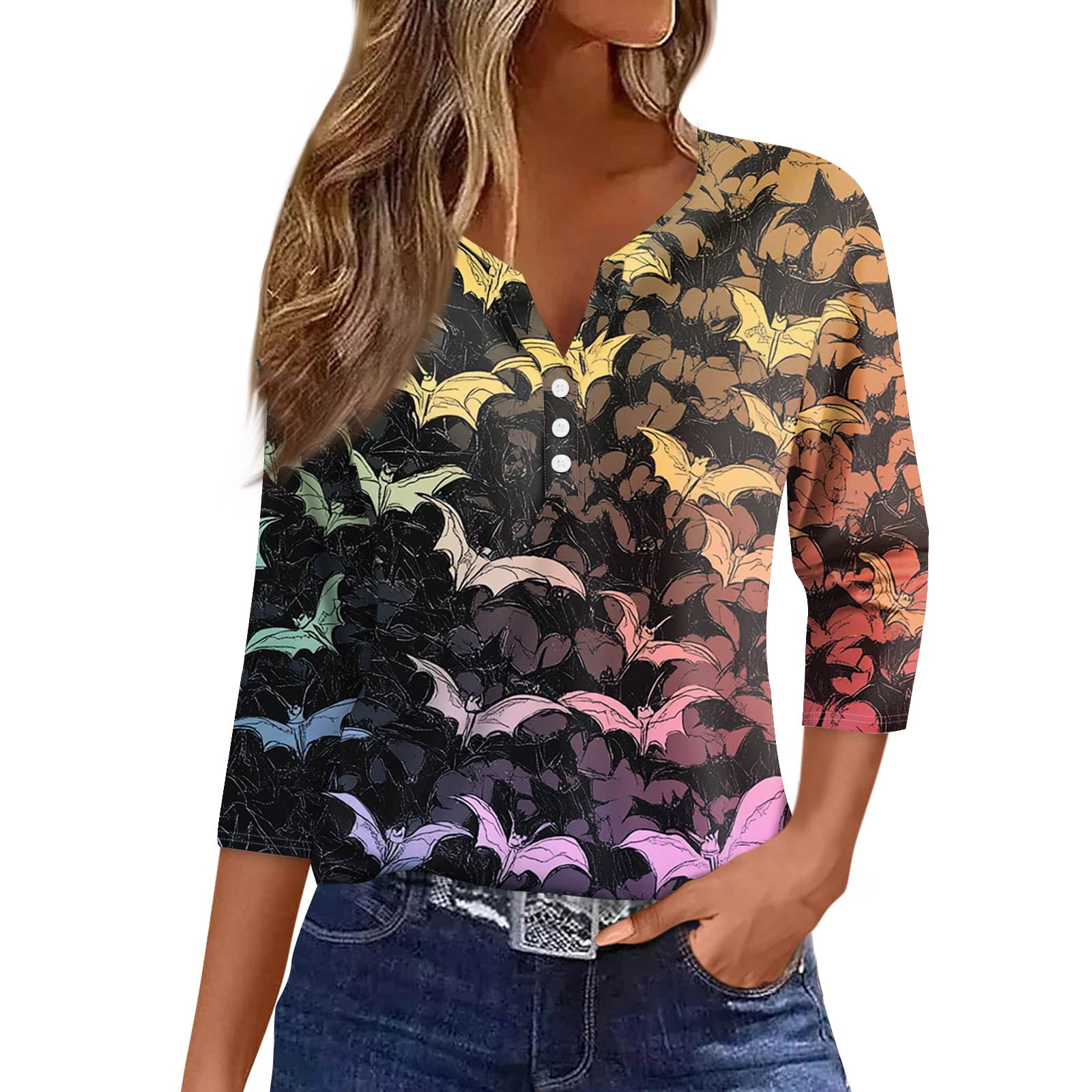 dGslk Women #39 s Halloween Bat Print Henley Shirt 3/4 Sleeve Gradient