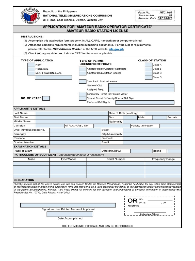 Form No NTC 1 03 APPLICATION FOR AMATEUR RADIO OPERATOR CERTIFICATE
