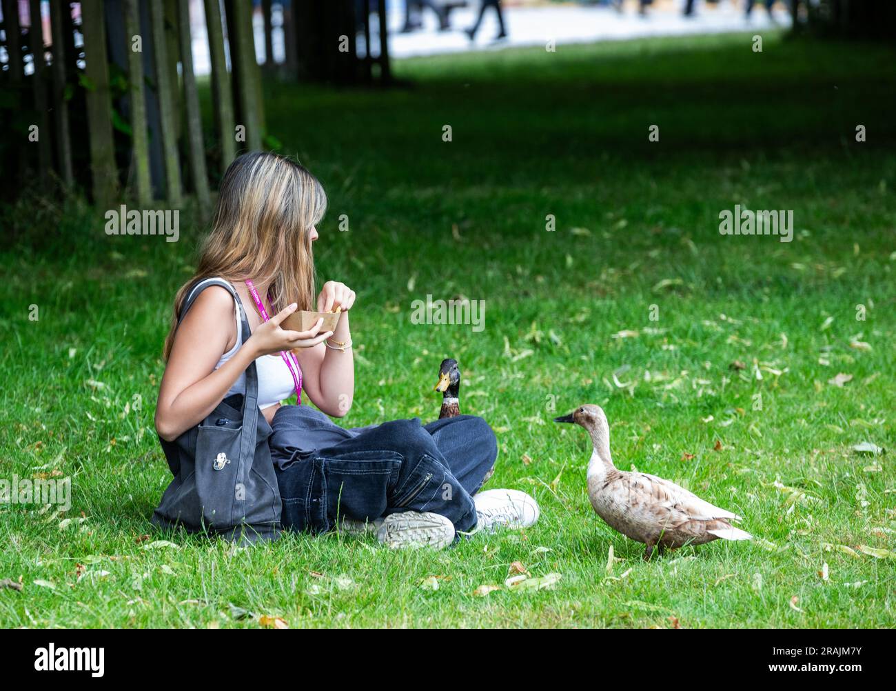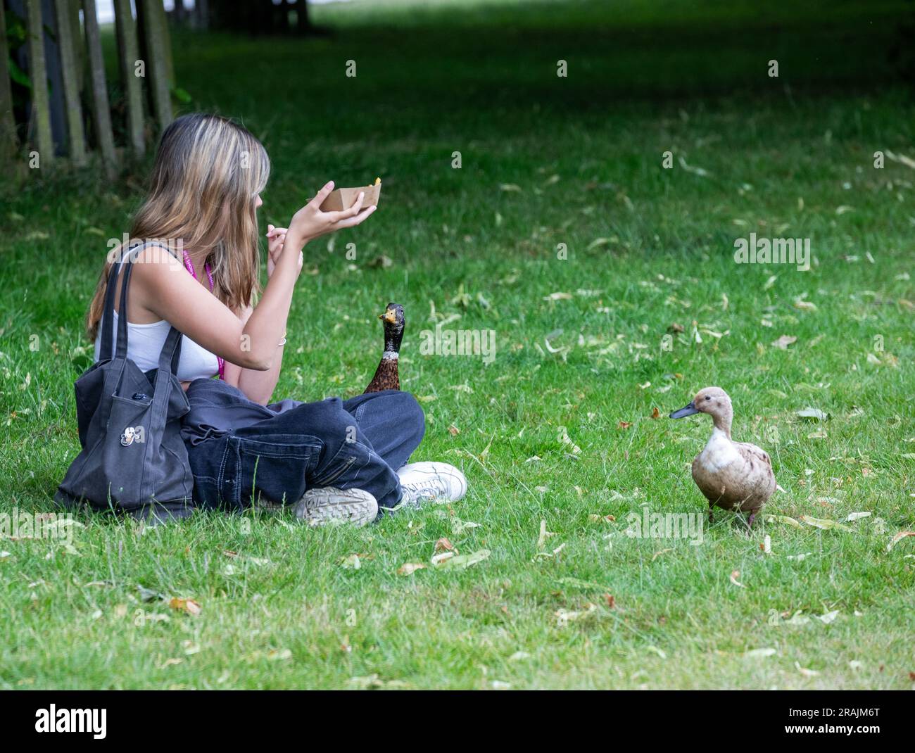 East Molesey UK 4th July 2023 A lady was joined by two geese as she