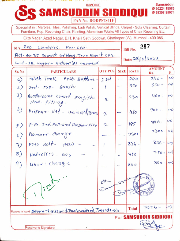 Single Invoice (Handwritten) PDF Interior Design