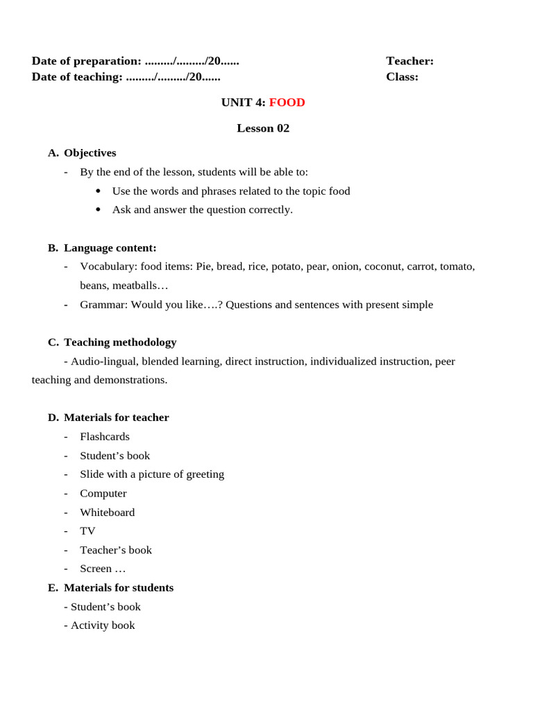 Unit 4 Food Lesson 2 Done PDF Meal Crossword