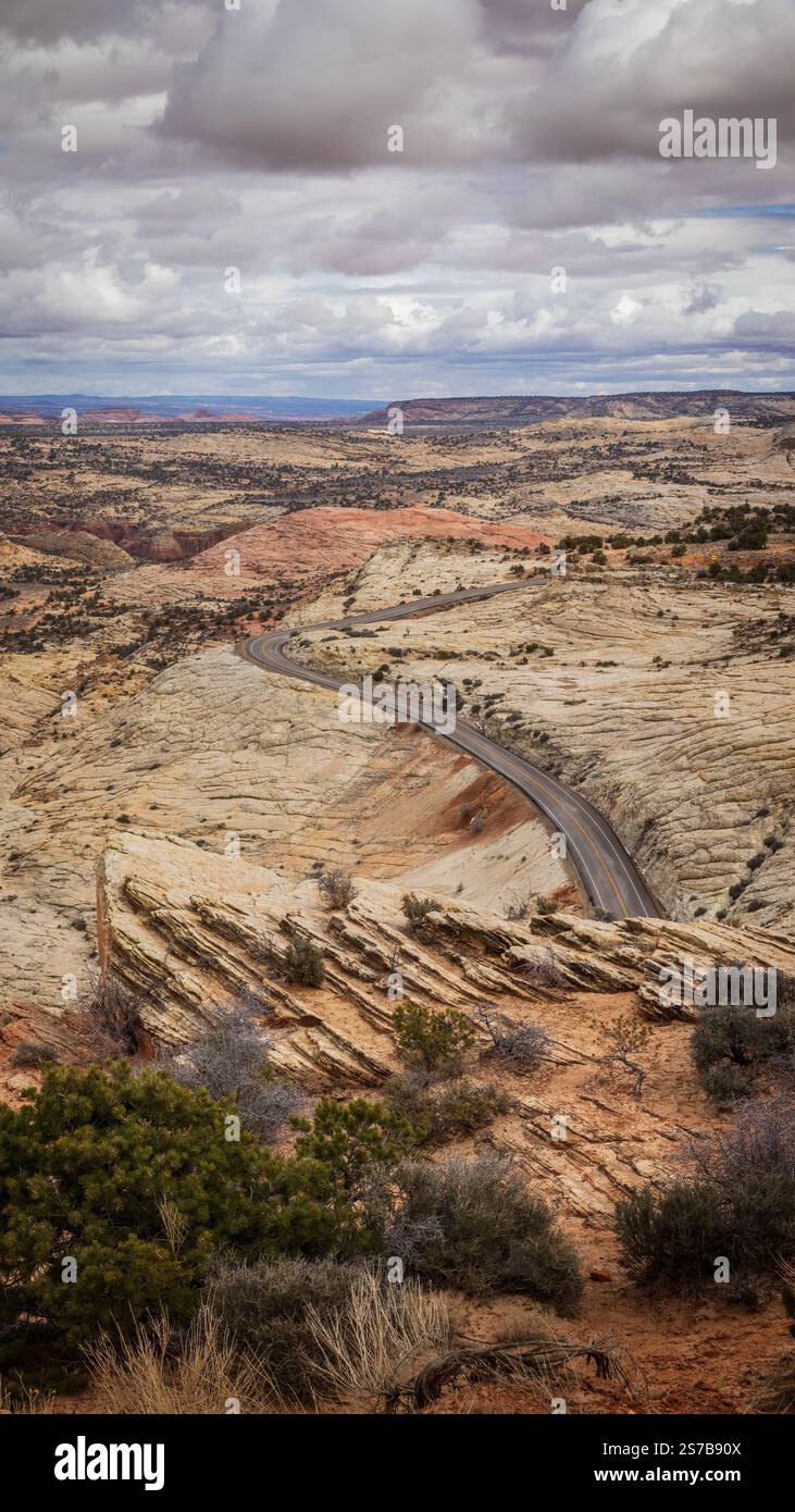 A winding road in Utah stretches through a breathtaking rocky landscape