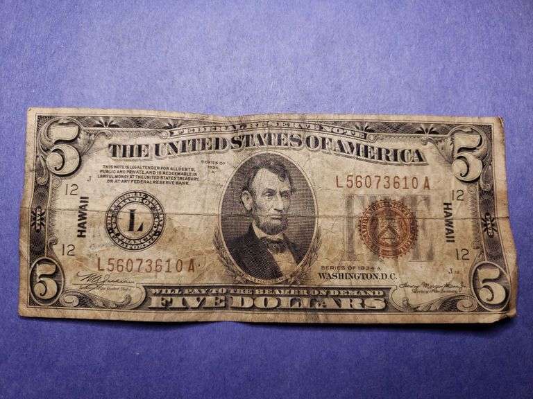 1934 A $5 Hawaii Silver Certificate Red Seal Baer Auctioneers