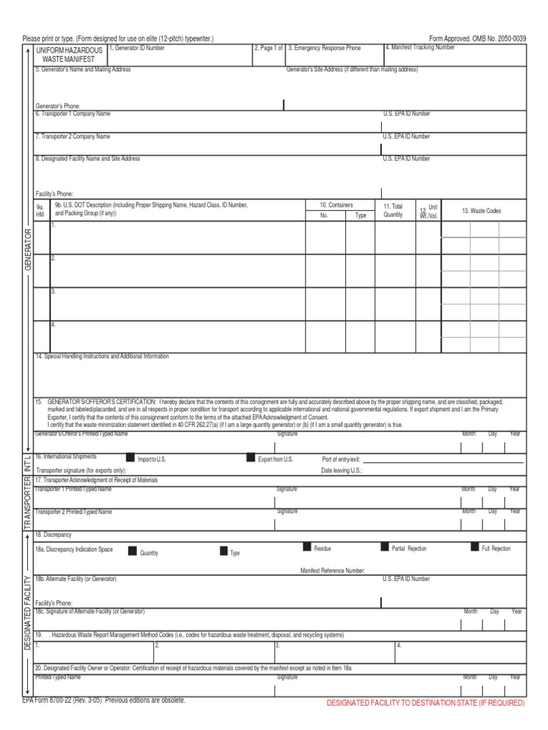 Hazardous Waste Manifest Form for Tracking Waste Transportation PDF
