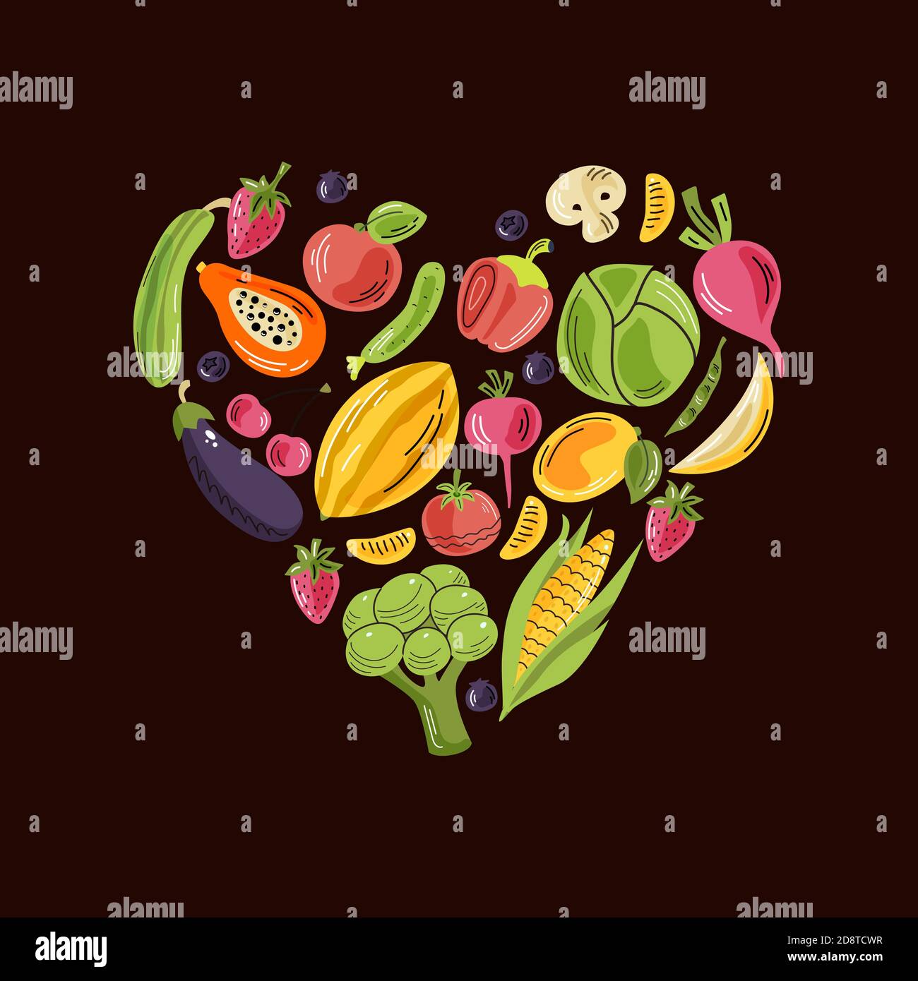 Heart Shaped Arrangement Of Fresh Fruits And Vegetables For World Vegan