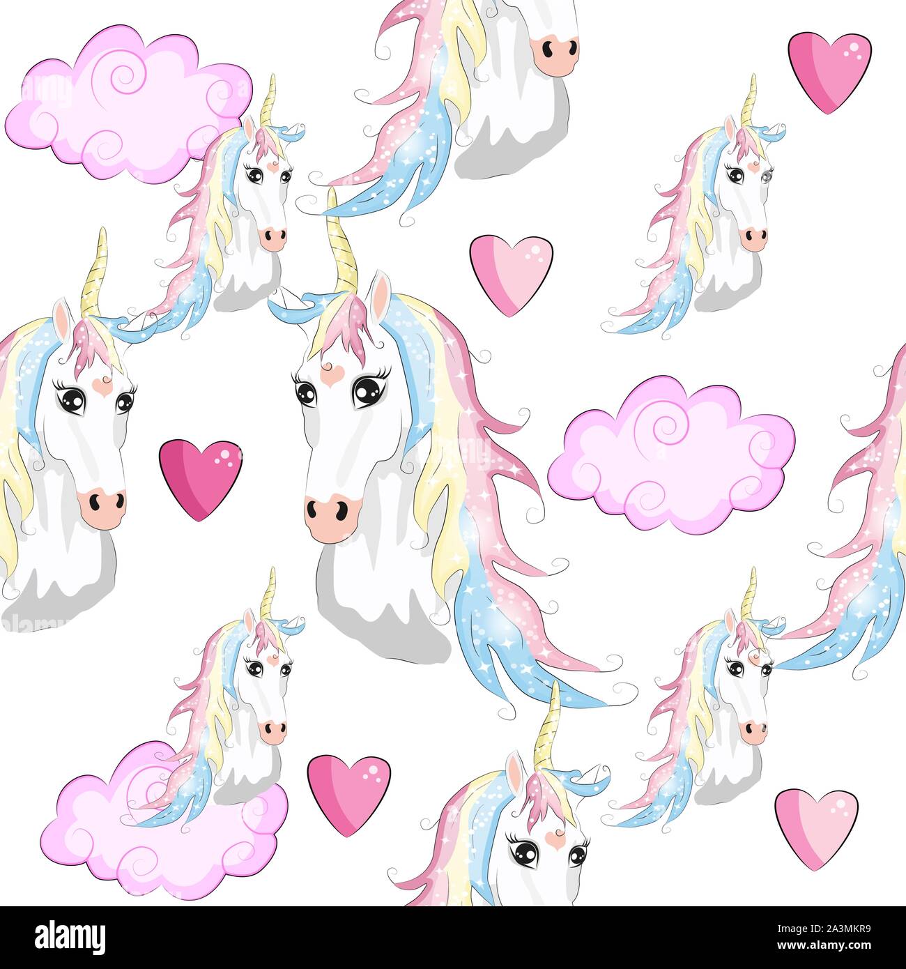 Seamless unicorn pattern with hearts flovers clouds rainbow and