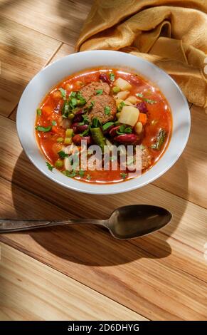 Hearty Italian minestrone soup with sliced sausage and vegetables Stock