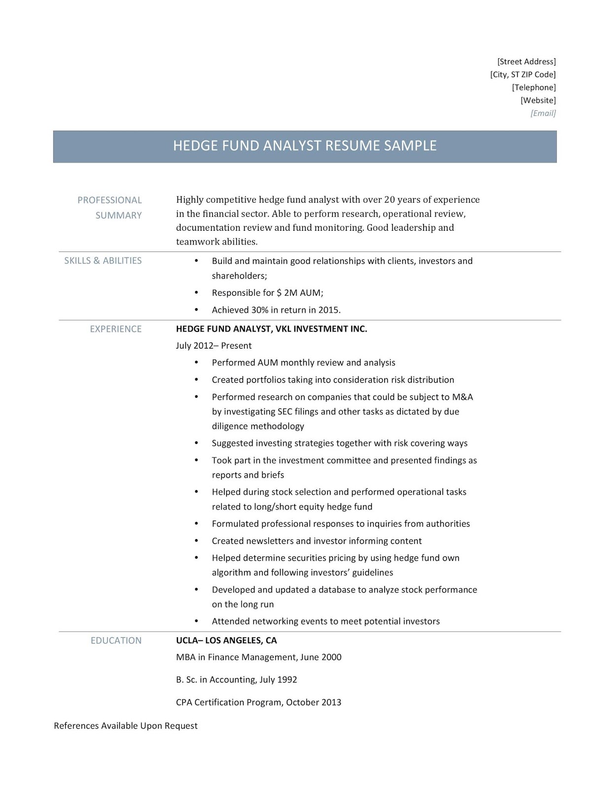Hedge Fund Analyst Resume Samples Velvet Jobs