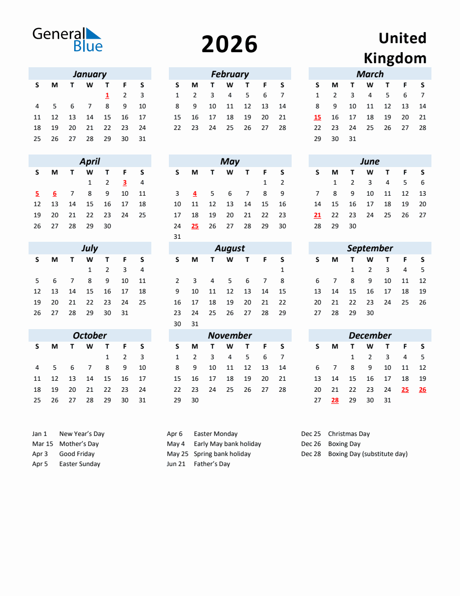Year 2026 Calendar United Kingdom