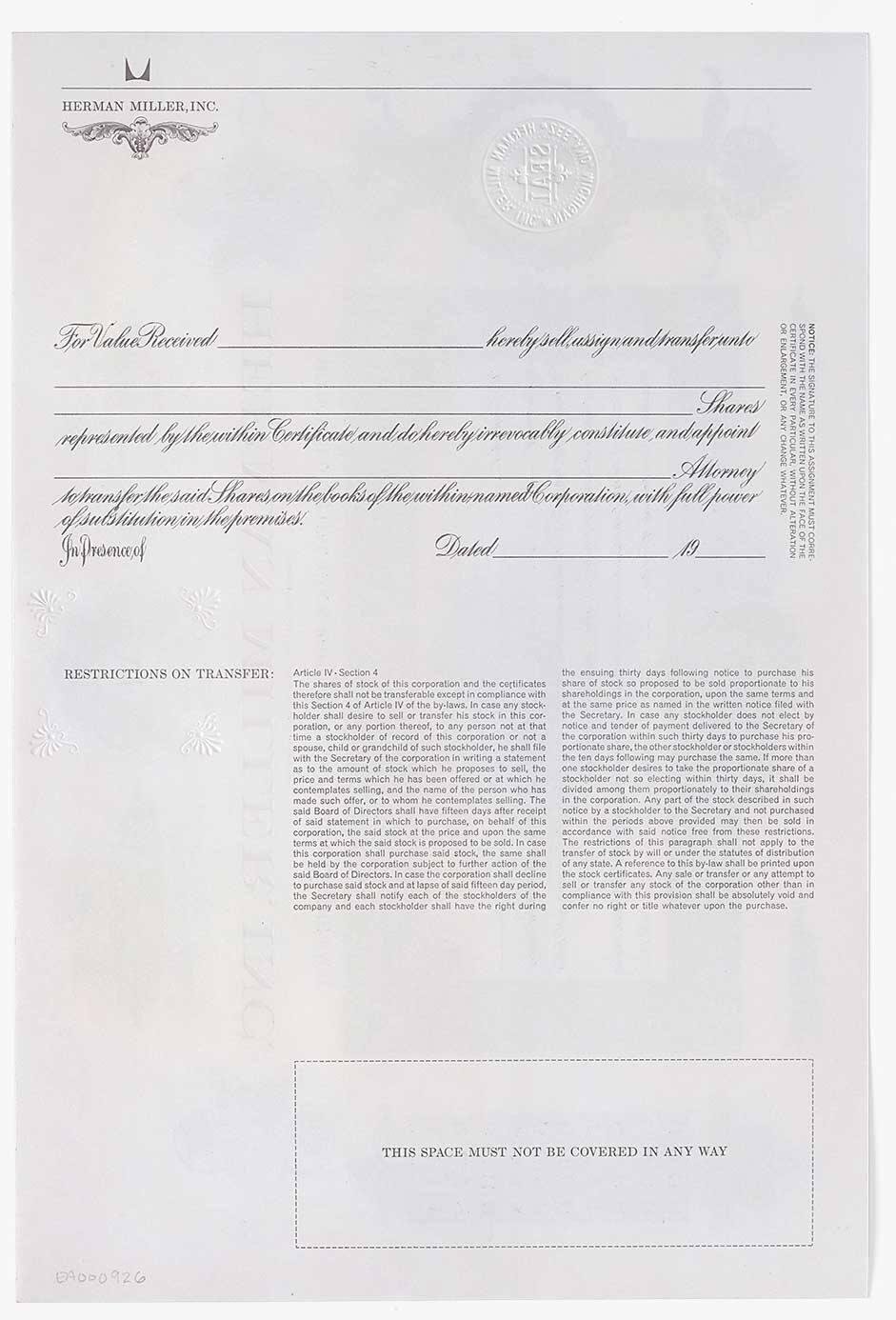 EO Herman Miller Stock Certificate Eames Office