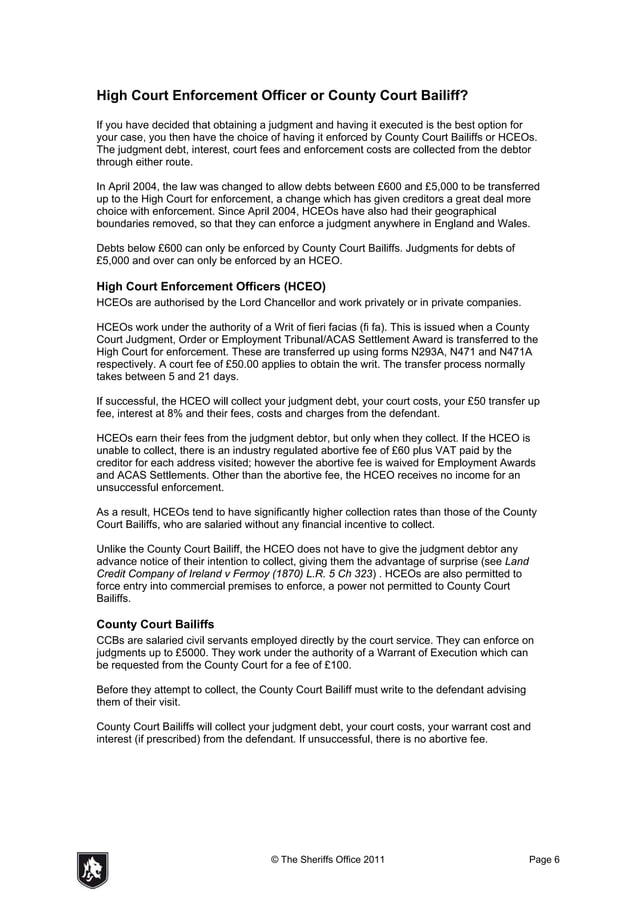 High Court Enforcement Officer or County Court The Sheriffs Office