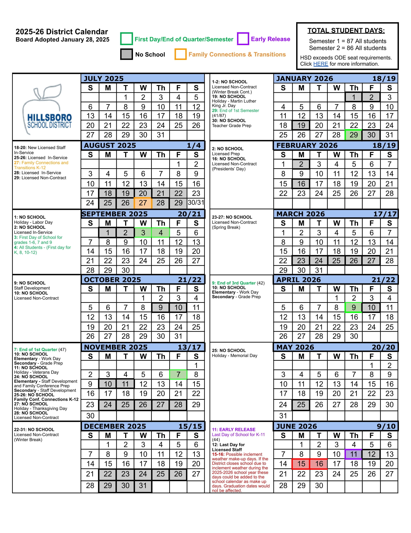 Hillsboro School District Calendar 2025 2026 School District Calendars
