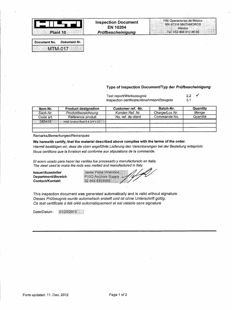 Hilti Certificate 22 385438 58 HAS Rod 3 4 X 21 Inspection Document