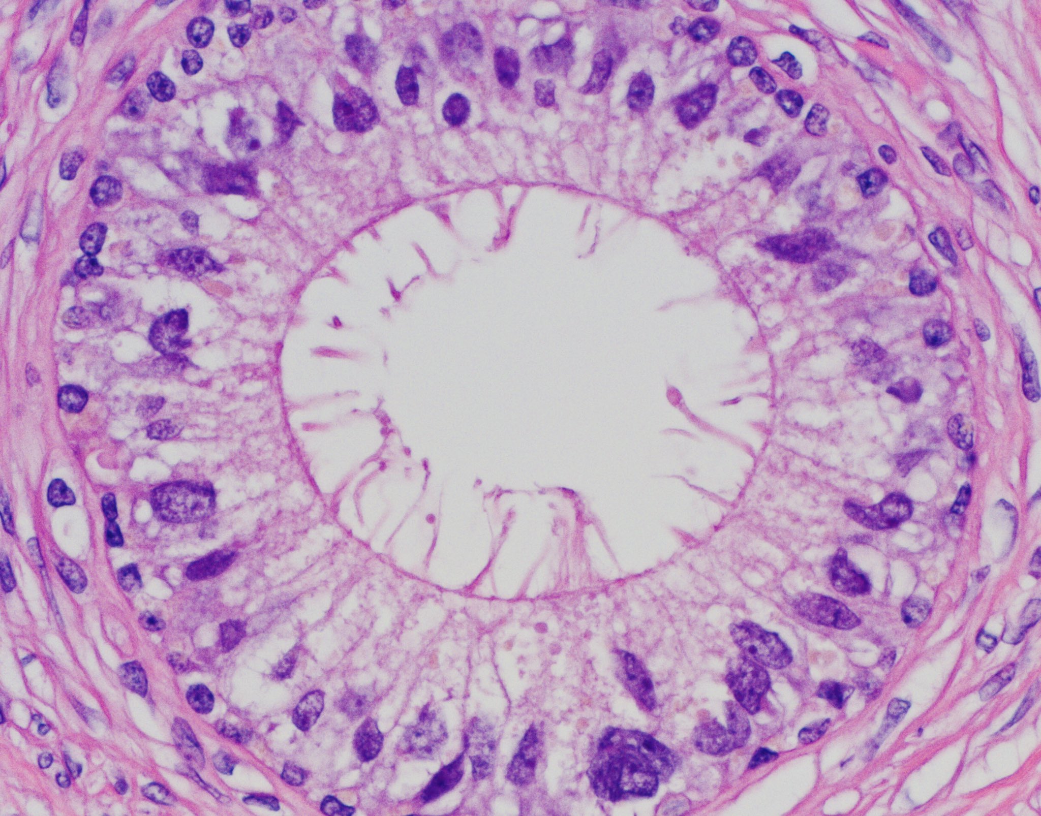 Histological slide of human testis seen under a microscope at x100