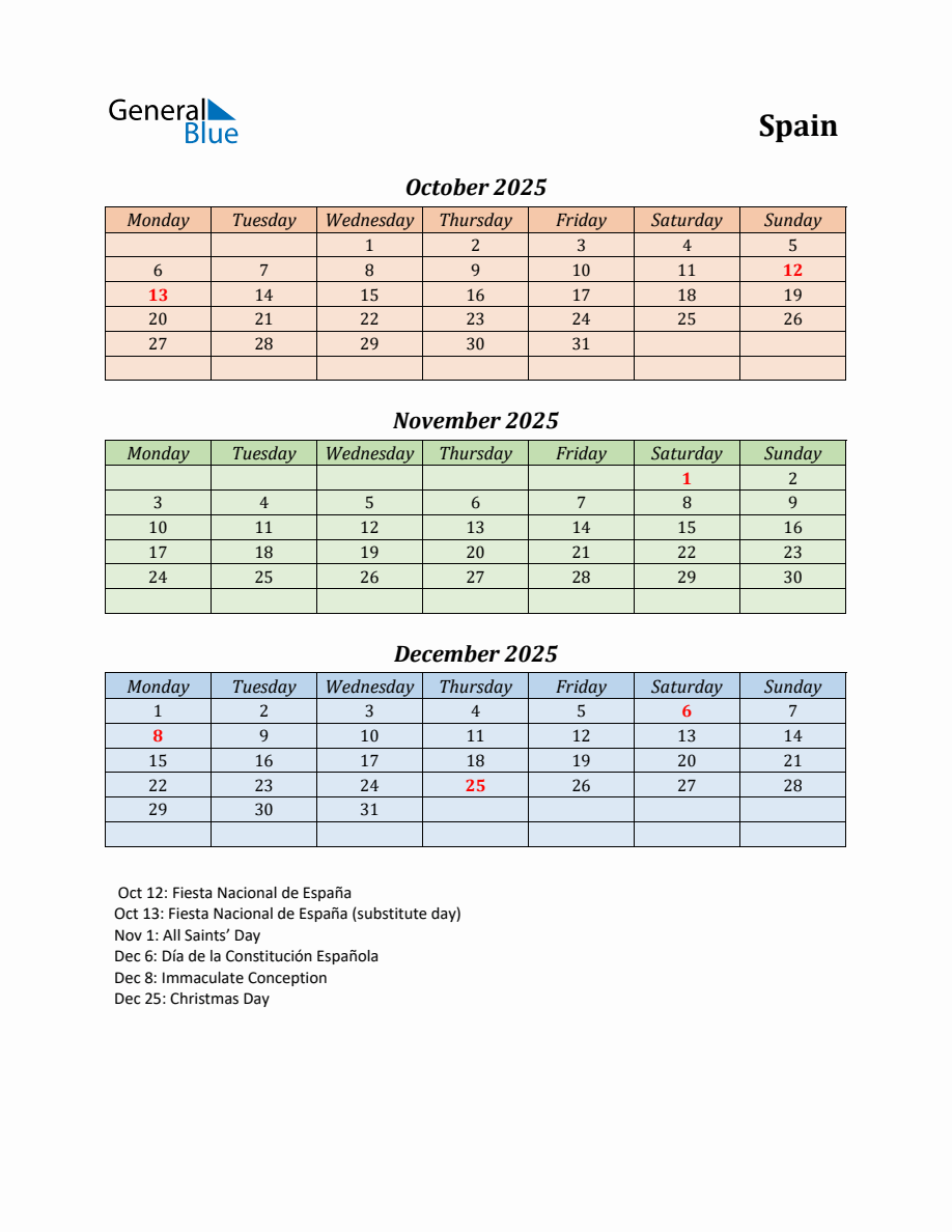 Q4 2025 Monday Start Quarterly Calendar with Spain Holidays