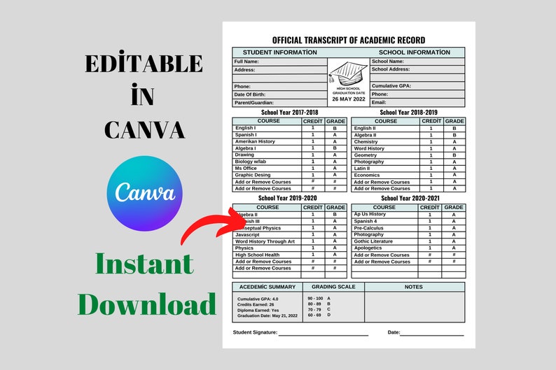 Printable Homeschool Transcript: Editable High School Template (canva