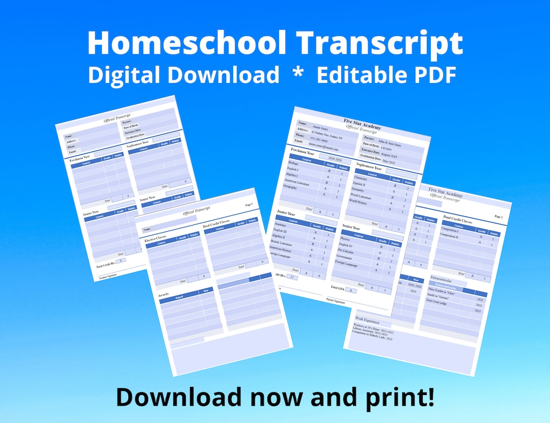 Homeschool Transcript EDITABLE PDF Form for Grades Credit Hours
