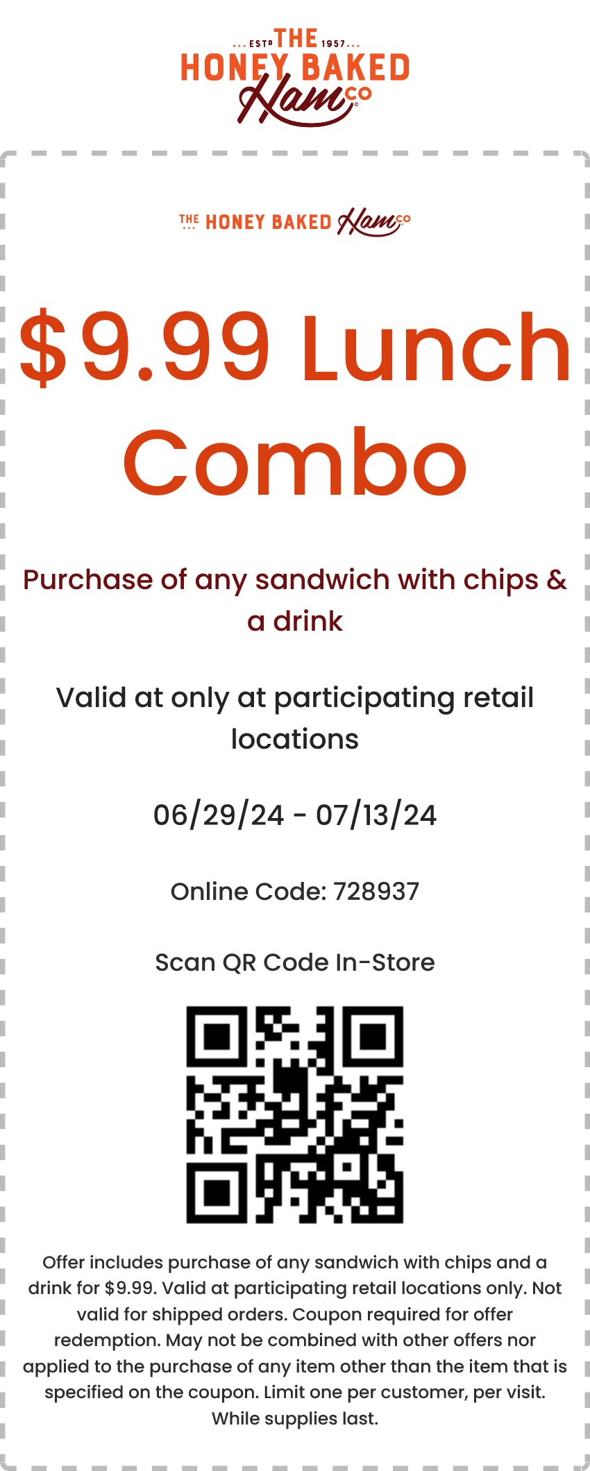 Sandwich chips drink = $10 at Honeybaked Ham restaurants #
