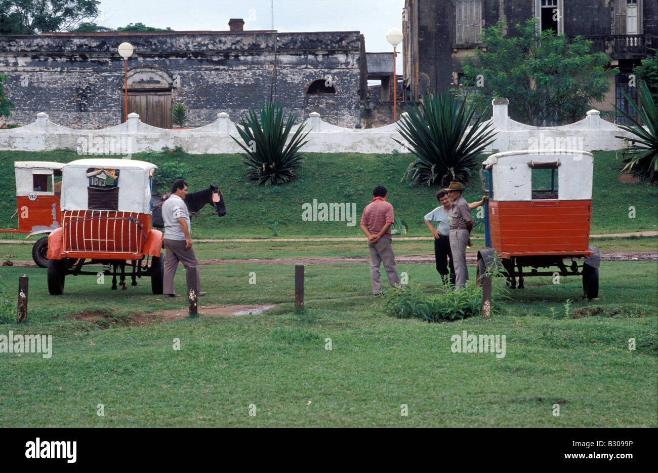 Horse drawn cabs outside railway station near Ciudad del Este Stock