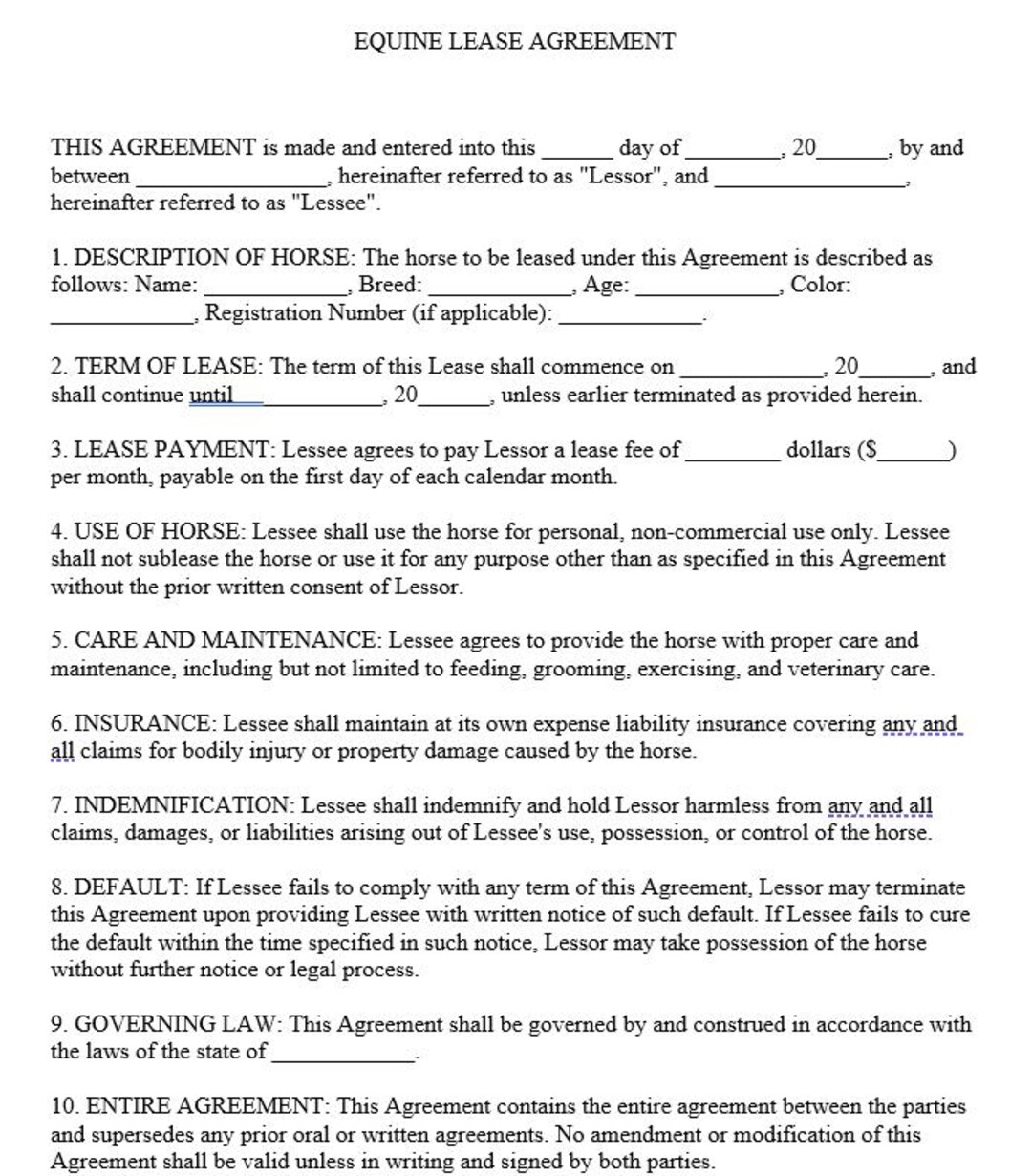 Horse Lease Agreement Template Etsy