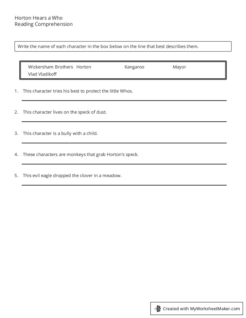 Horton Hears a Who Reading Comprehension My Worksheet Maker: Create