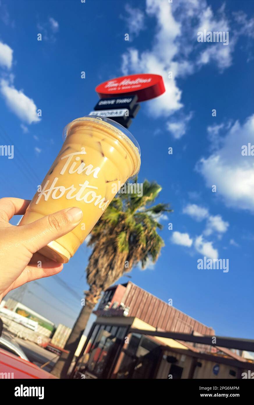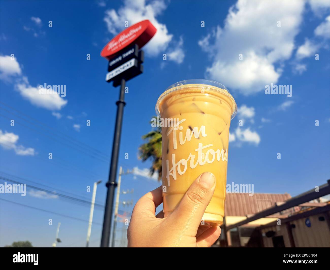 Houston Texas USA 08 30 2023: Tim Hortons building exterior and