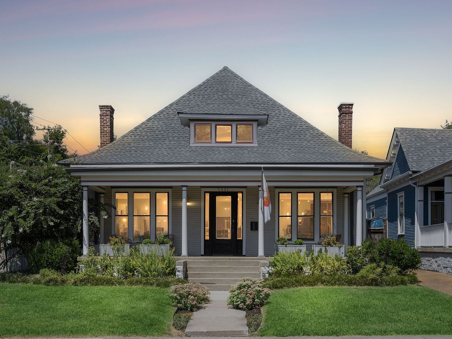 A Dutch colonial house with a gambrel roof dormer windows and a