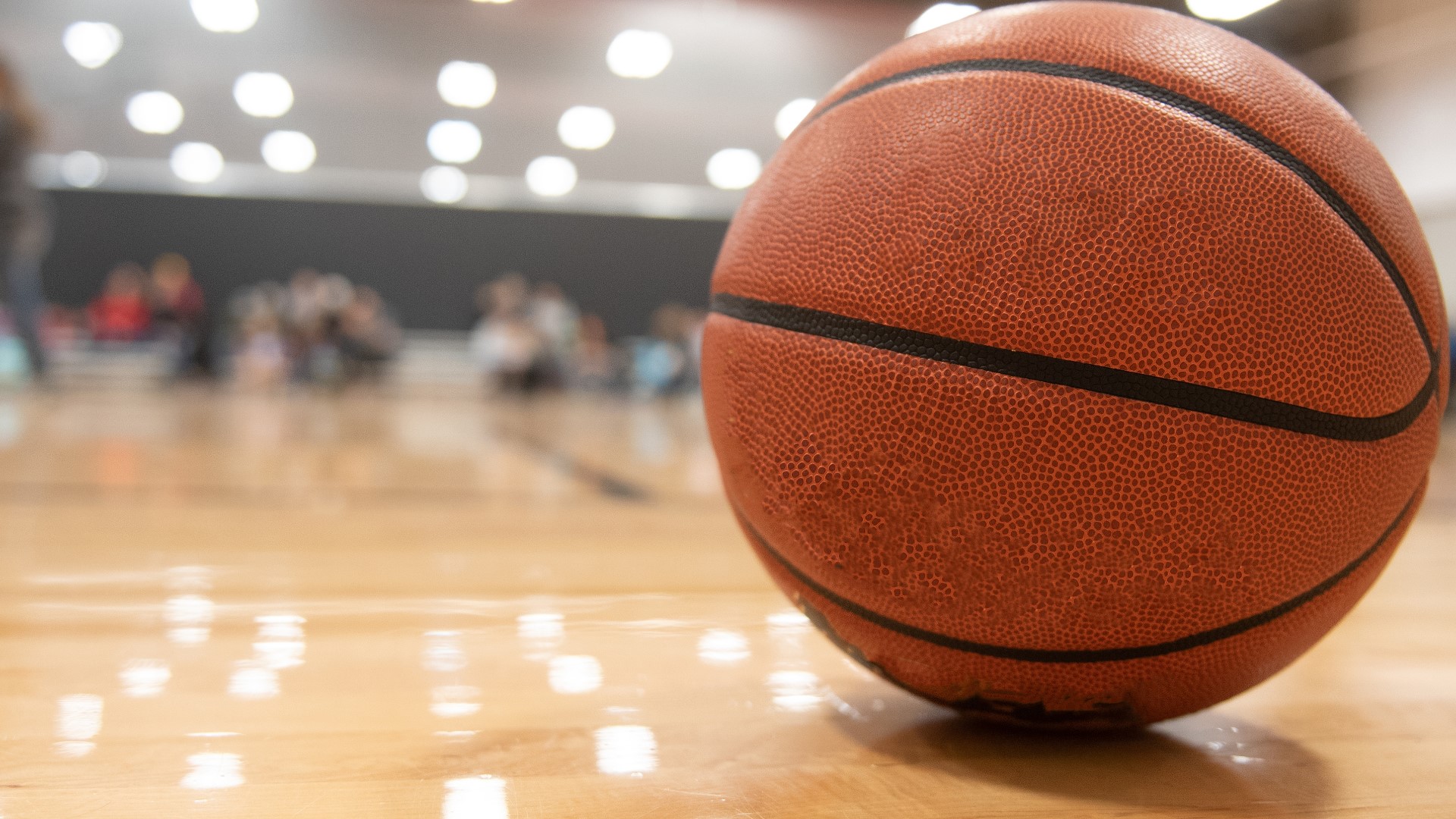 Basketball on Wooden Court Surrounded by Blurred Players and Equipment