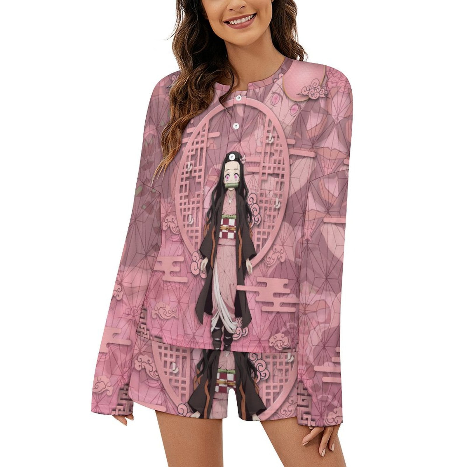 Demon Slayer Nezuko Womens Button Down Pajamas Set Long Sleeve