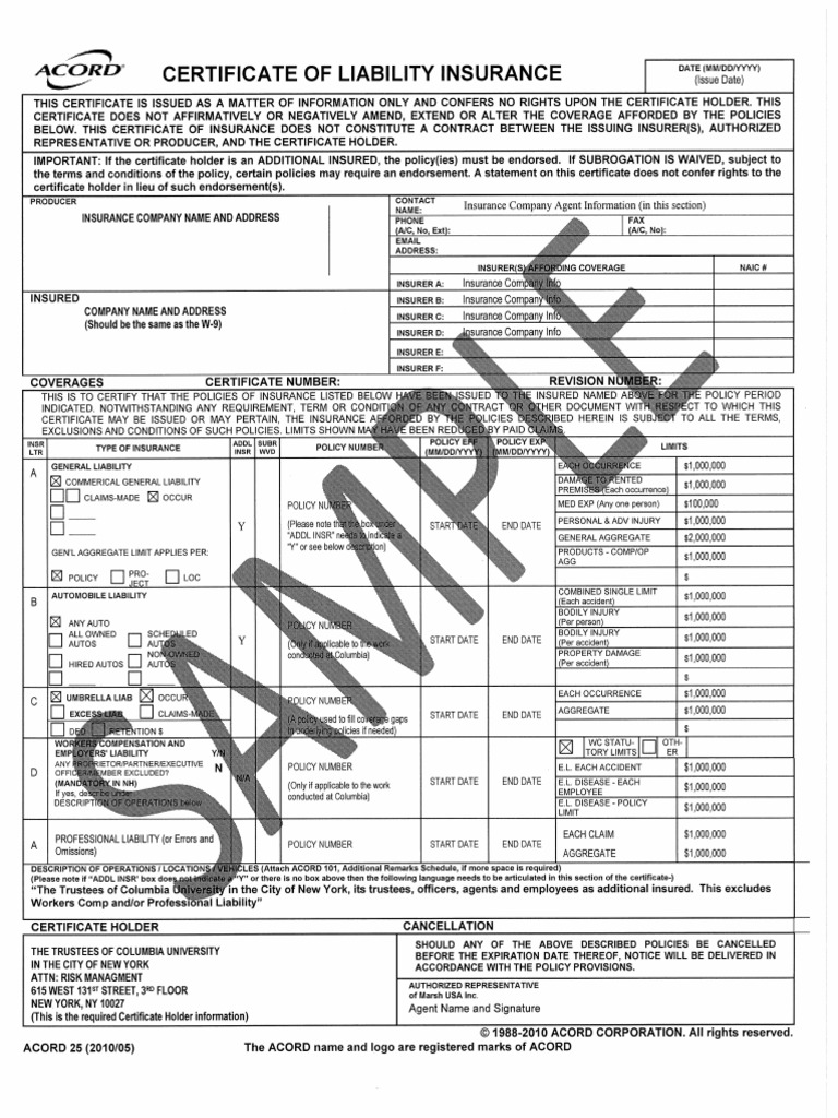 Acord Certificate Of Liability Insurance Template