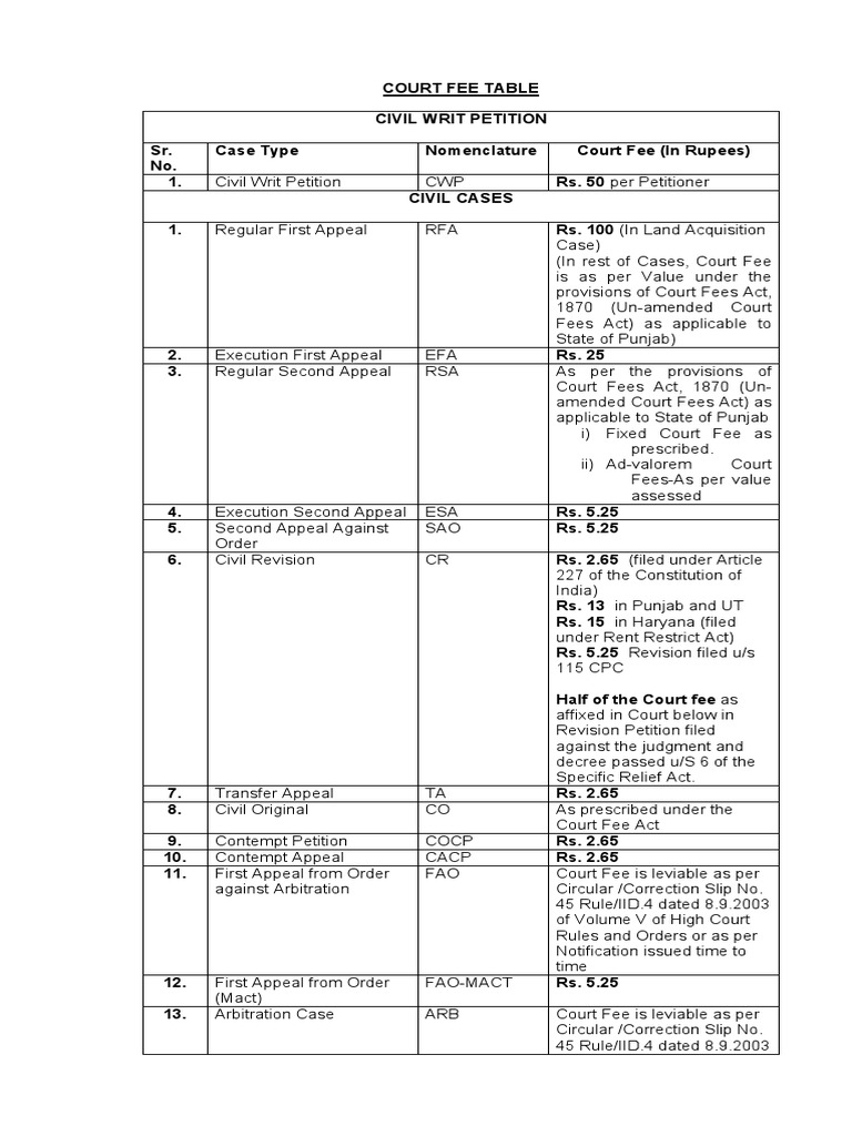 Court Fee Table PDF Bail Habeas Corpus