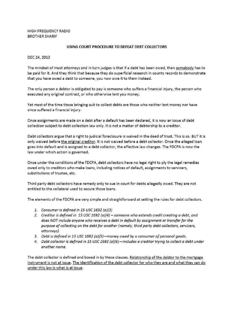 Using Court Procedure To Defeat Debt Collectors 12 24 13 NOTES PDF
