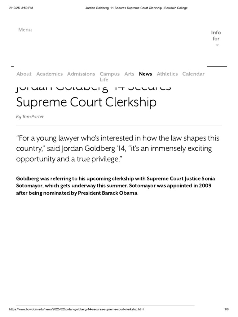 Jordan Goldberg #39 14 Secures Supreme Court Clerkship Bowdoin College