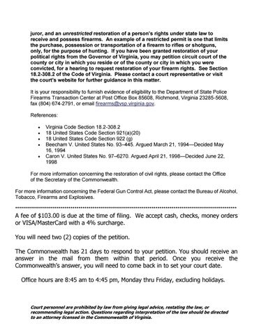 Nccco restoration of firearms with sample petition by Norfolk Circuit