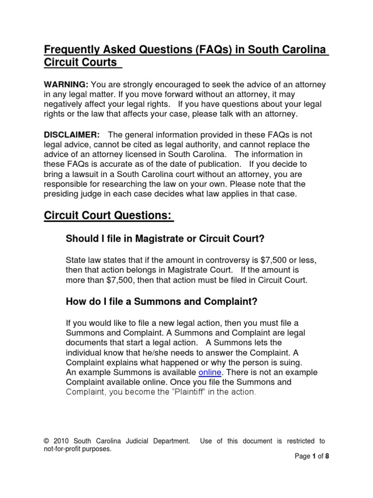 Frequently Asked Questions (Faqs) in South Carolina Circuit Courts