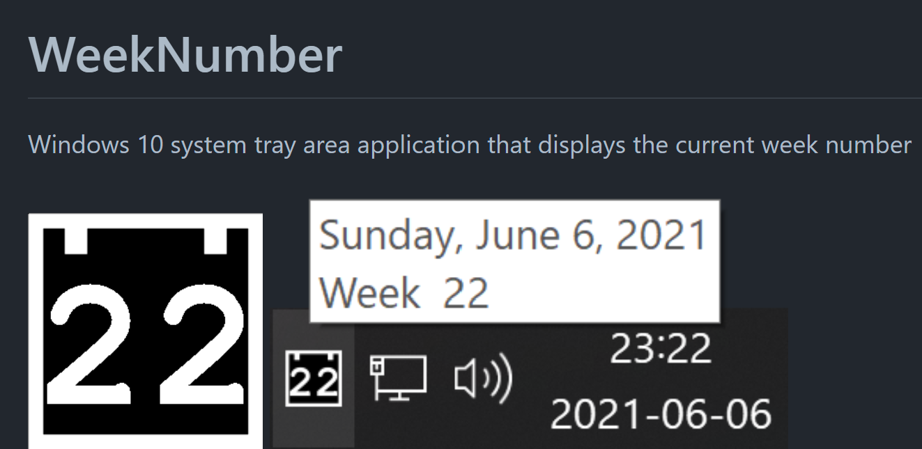 WeekNumber Windows 11/10 system tray application that displays the