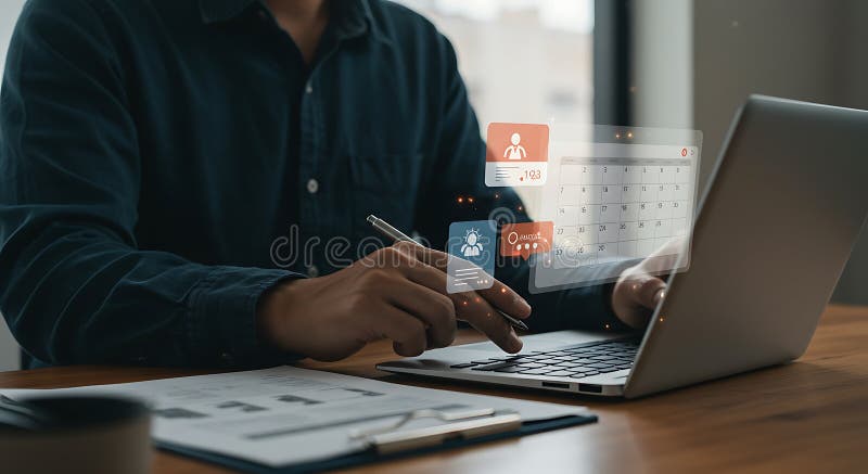 Man Using Laptop with Digital Calendar and Business Analytics Interface
