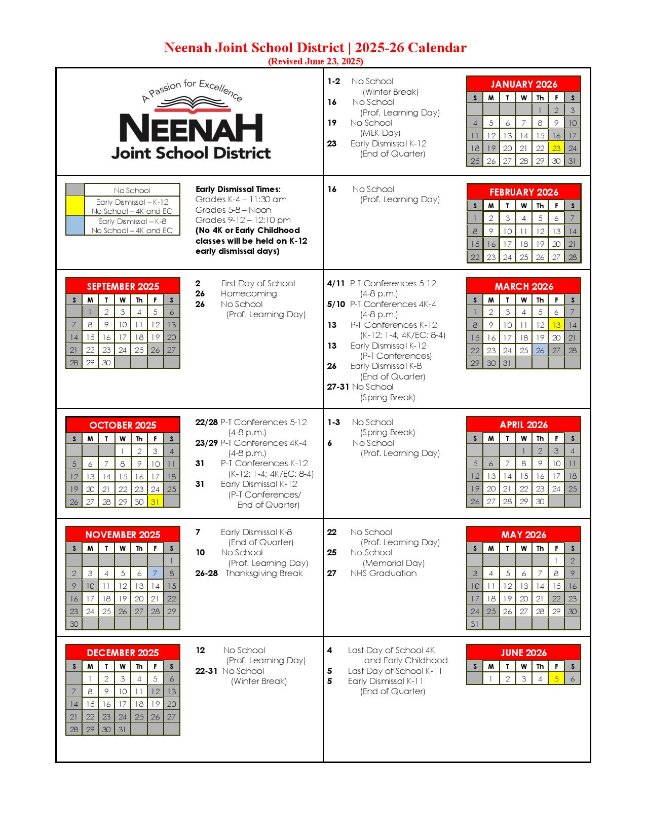 Neenah Joint School District Calendar 2025 2026 in PDF