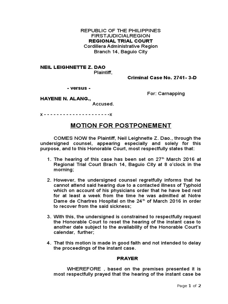 Motion For Continuance Template