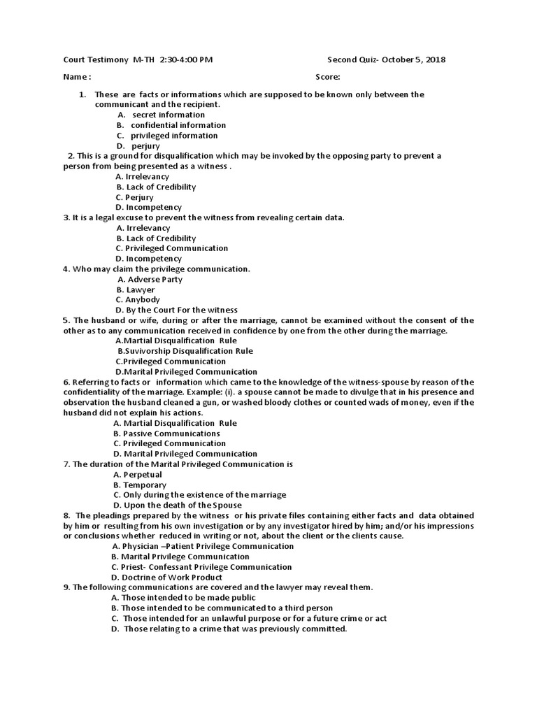 Court Testimony Sample MCQ PDF Attorney Client Privilege