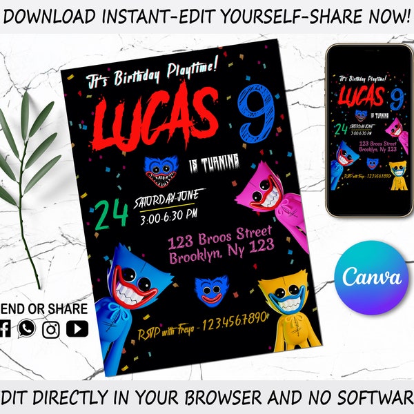 Huggy Wuggy Digital Invitation Customizable Template DIY Wowtemp