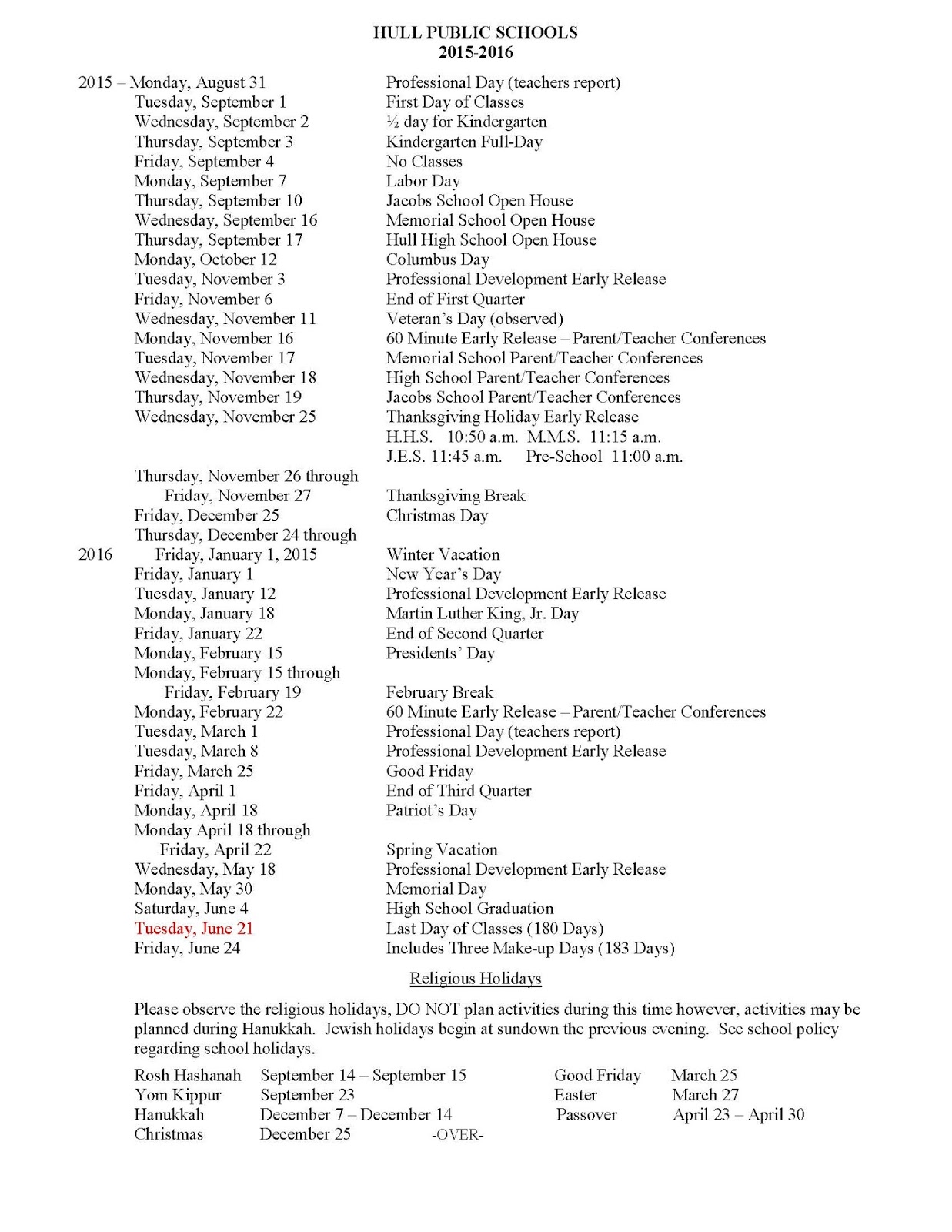 Hull Public Schools Blog: School Calendar Fourth Revision