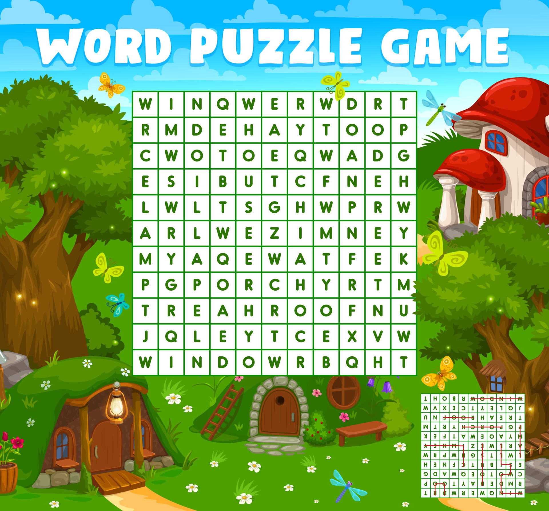 Cartoon forest fairy dwellings and elf houses word search puzzle game
